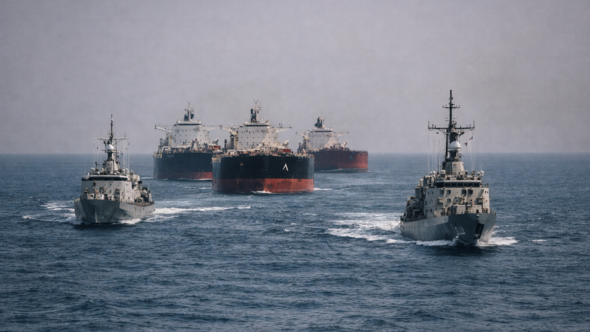 Visualize supertankers creeping single-file behind Arleigh Burke destroyers, DFC seals replacing Lloyd’s stamps.